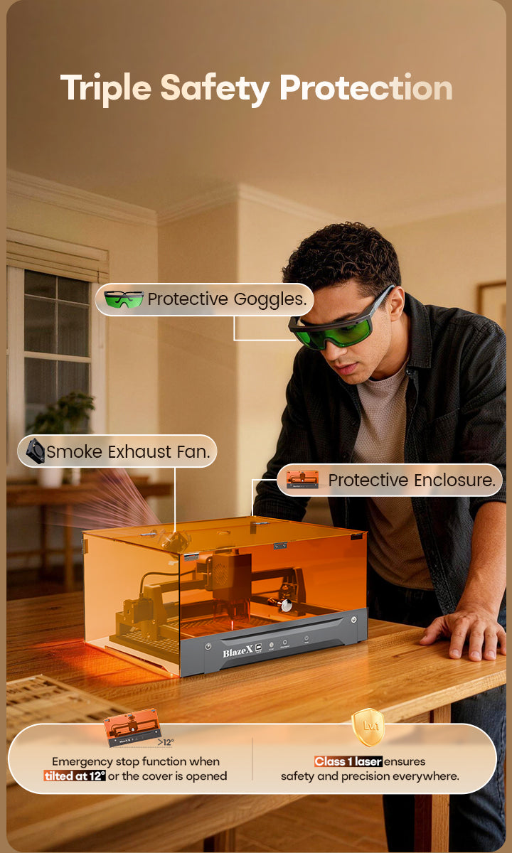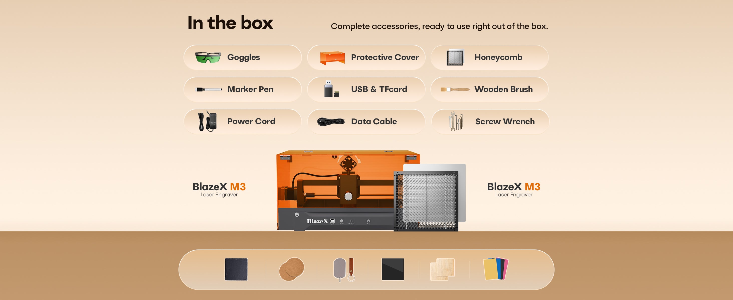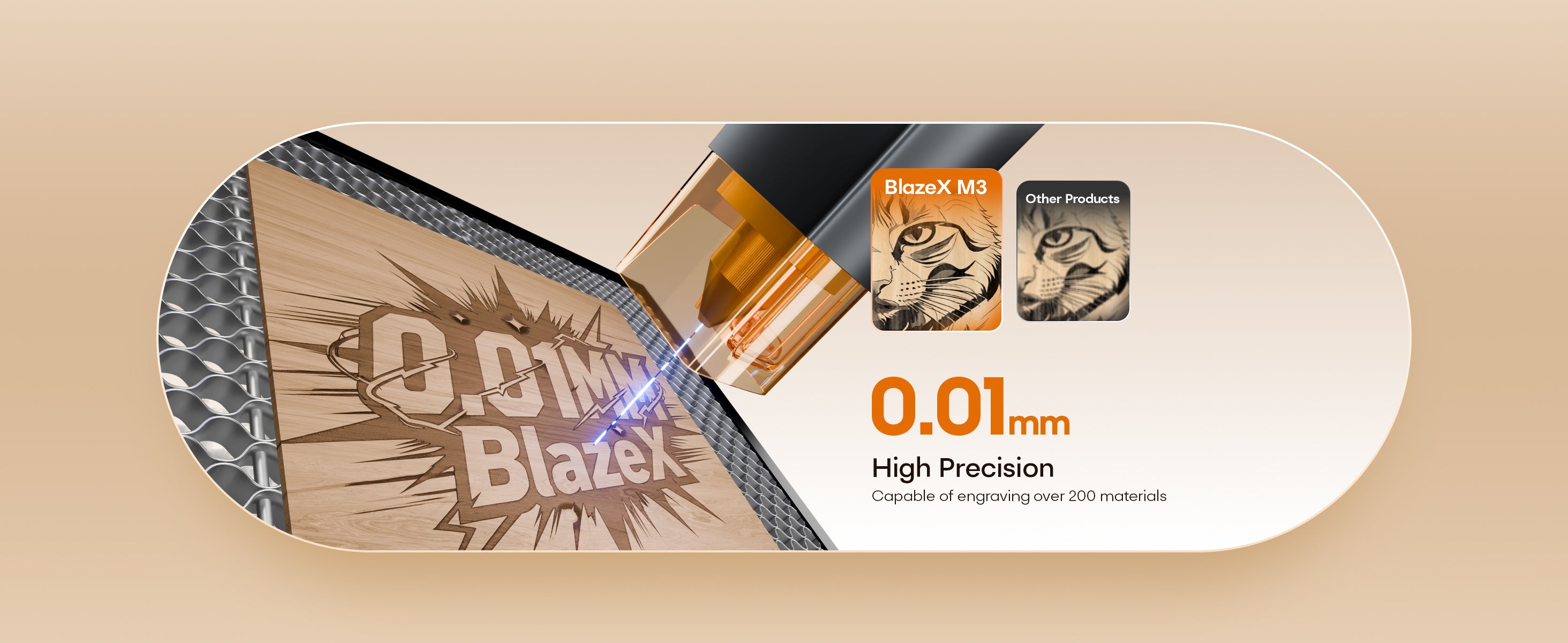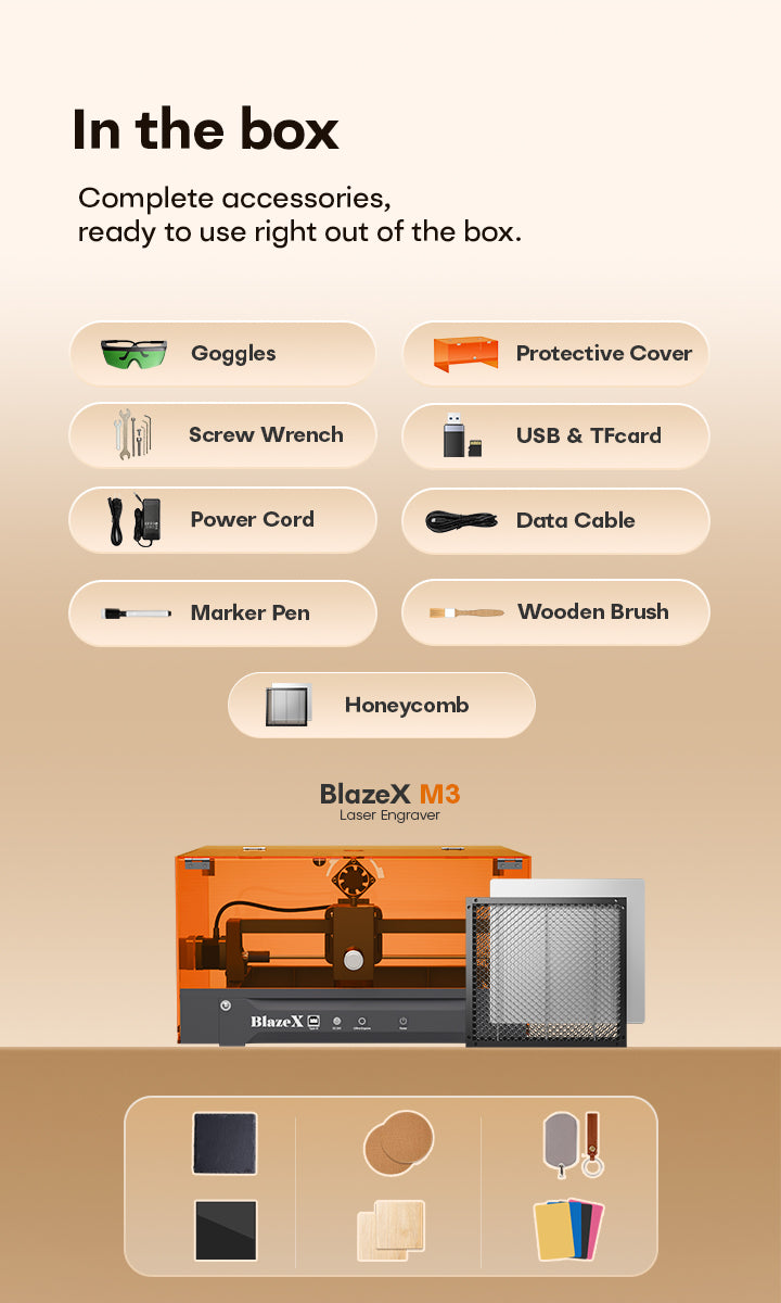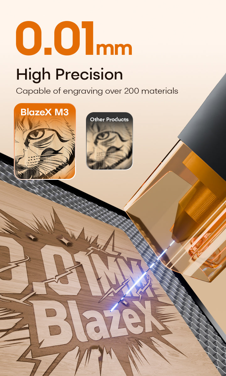 I’m very impressed with the BlazeX M3 Pro. Setup was quick and straightforward, even for a beginner. The 10W laser is powerful enough to engrave and cut cardboard, wood, and plastic cleanly. Great value for a compact machine.