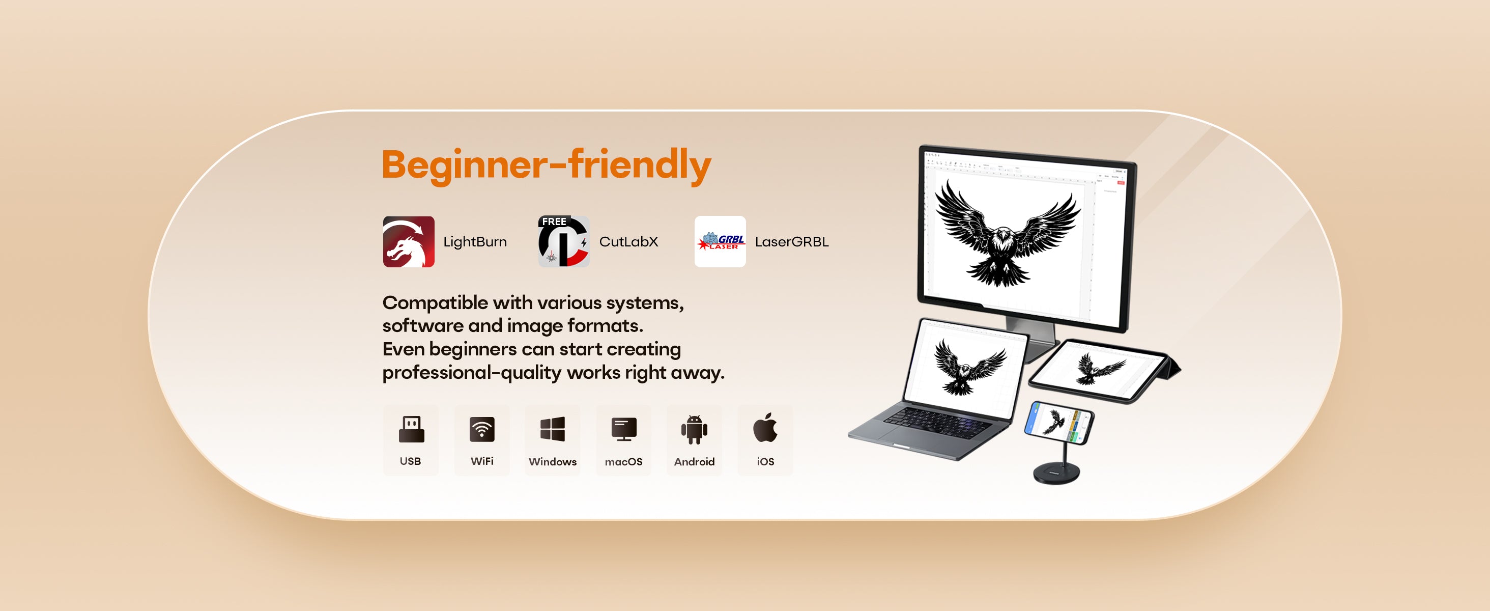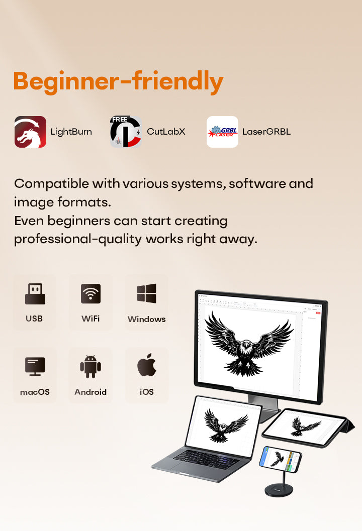 · Smart App Integration: Compatible with LightBurn, CutLabX and LaserGRBL, giving you full creative control through your preferred software.