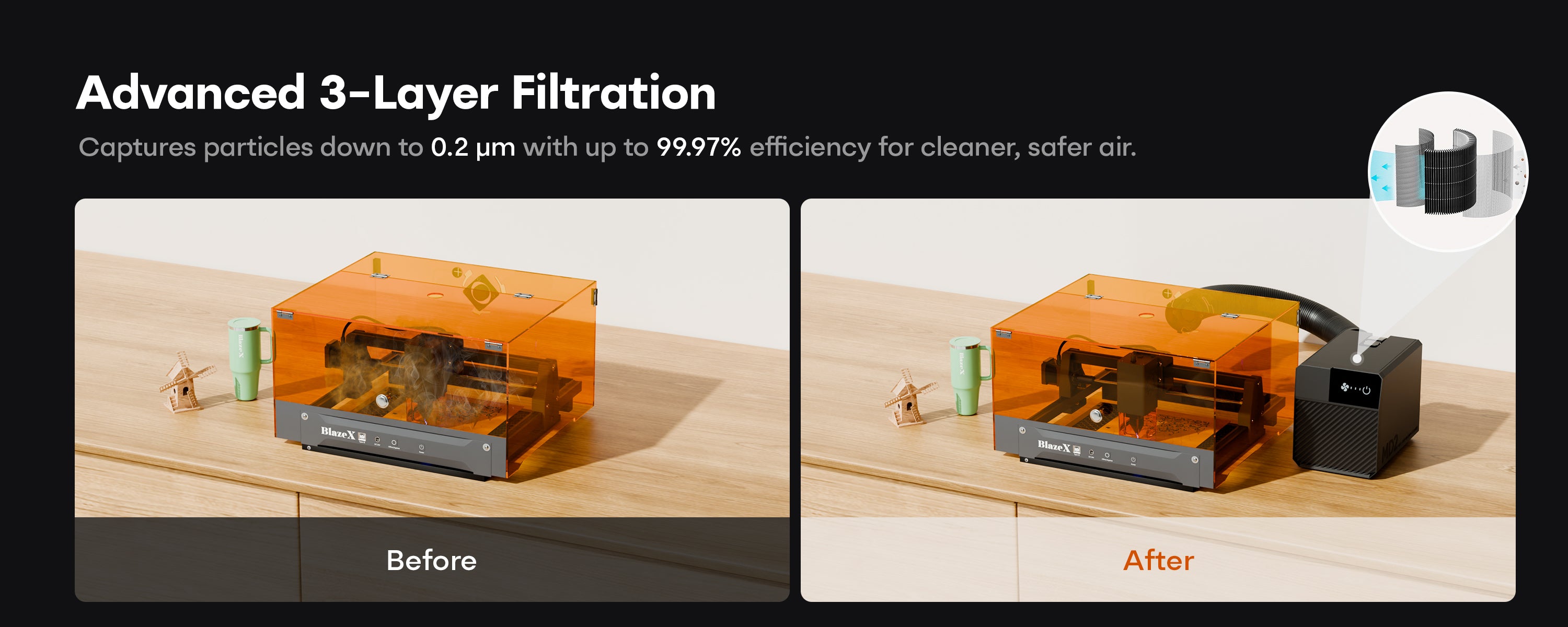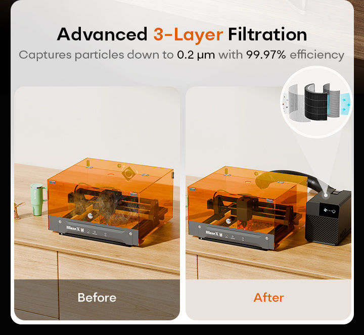 Powerful 3-Layer Filtration: Captures particles down to 0.2 μm with an impressive 99.97% purification efficiency.