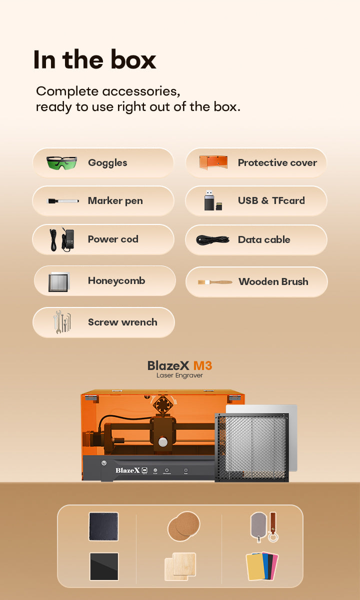 “I’m very impressed with the BlazeX M3 Pro. Setup was quick and straightforward, even for a beginner. The 10W laser is powerful enough to engrave and cut cardboard, wood, and plastic cleanly. Great value for a compact machine.”